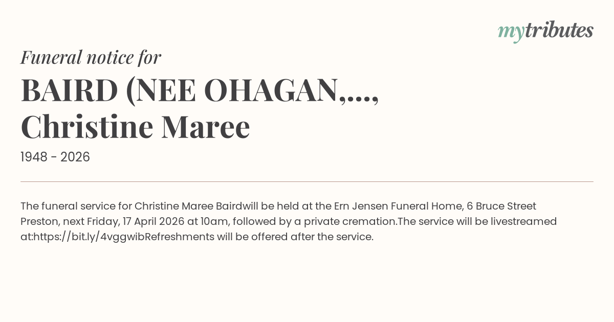 will be held at the Ern Jensen Funeral Home, 6 Bruce Street Preston, next Friday, 17 April 2026 at 10am, followed by a private cremation.