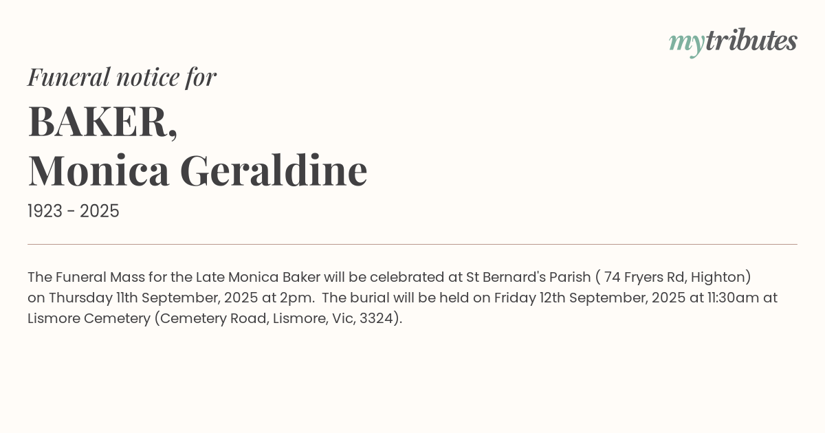 19°CThe Funeral Mass for the Late Monica Baker will be celebrated at St Bernard's Parish ( 74 Fryers Rd, Highton) on Thursday 11th September, 2025 at 2pm. The burial will be held on Friday 12th September, 2025 at 11:30am at Lismore Cemetery (Cemetery Road, Lismore, Vic, 3324).