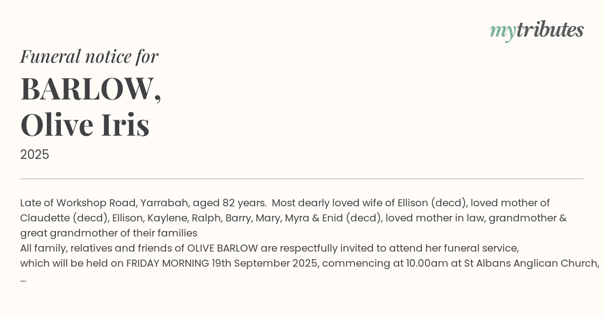 All family, relatives and friends of OLIVE BARLOW are respectfully invited to attend her funeral service, which will be held on FRIDAY MORNING 19th September 2025, commencing at 10.00am at St Alban’s Anglican Church, Yarrabah, followed by interment at the Yarrabah Monumental Cemetery.