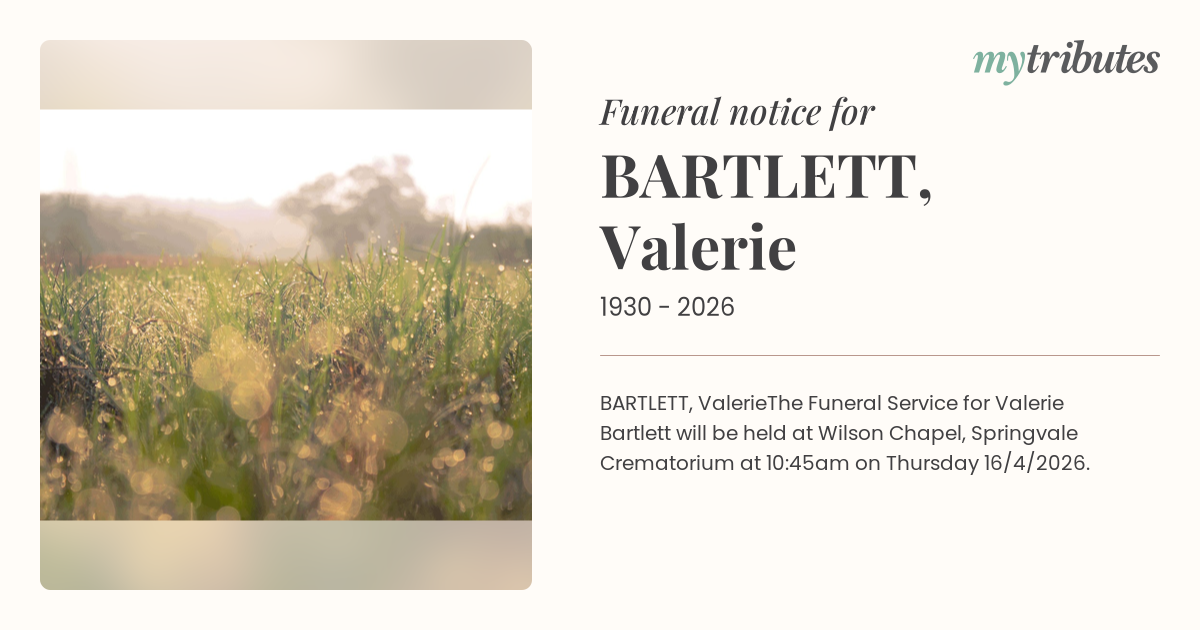 The Funeral Service for Valerie Bartlett will be held at Wilson Chapel, Springvale Crematorium at 10:45am on Thursday 16/4/2026.