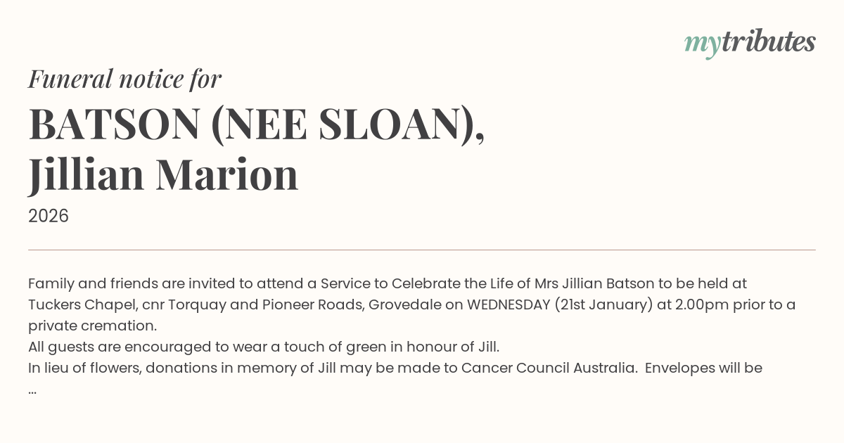 19°CFamily and friends are invited to attend a Service to Celebrate the Life of Mrs Jillian Batson to be held at Tuckers Chapel, cnr Torquay and Pioneer Roads, Grovedale on WEDNESDAY (21st January) at 2.00pm prior to a private cremation.