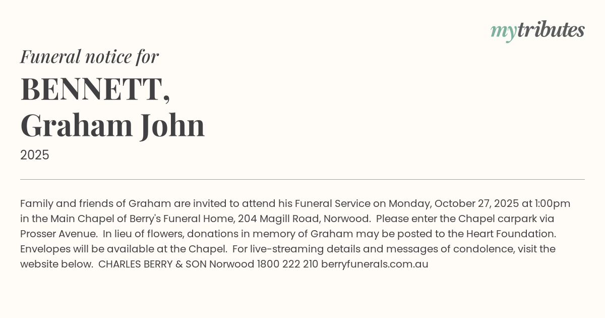19°CFamily and friends of Graham are invited to attend his Funeral Service on Monday, October 27, 2025 at 1:00pm in the Main Chapel of Berry's Funeral Home, 204 Magill Road, Norwood.