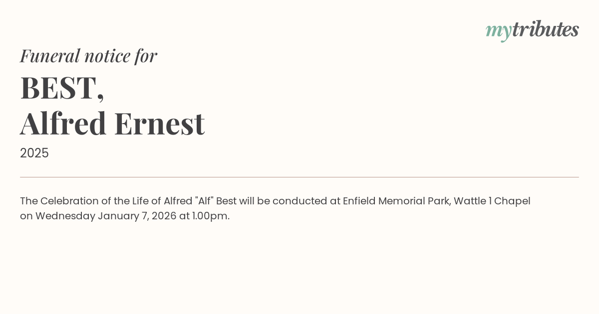 19°CThe Celebration of the Life of Alfred "Alf" Best will be conducted at Enfield Memorial Park, Wattle 1 Chapel on Wednesday January 7, 2026 at 1.00pm.