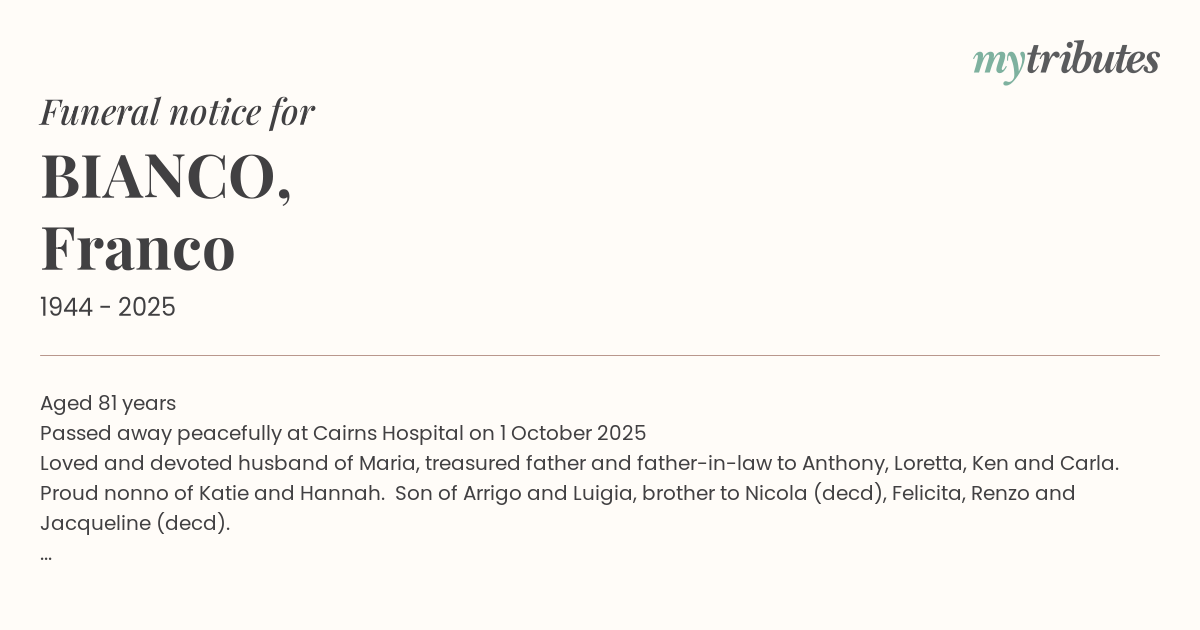 A memorial mass to celebrate Franco’s life will be held at Our Lady Help of Christians Church at 18 Balaclava Road, Earlville, on Monday, 27 October at 10.00 am, followed by interment at Cairns Cemetery, Martyn Street, Manunda.
