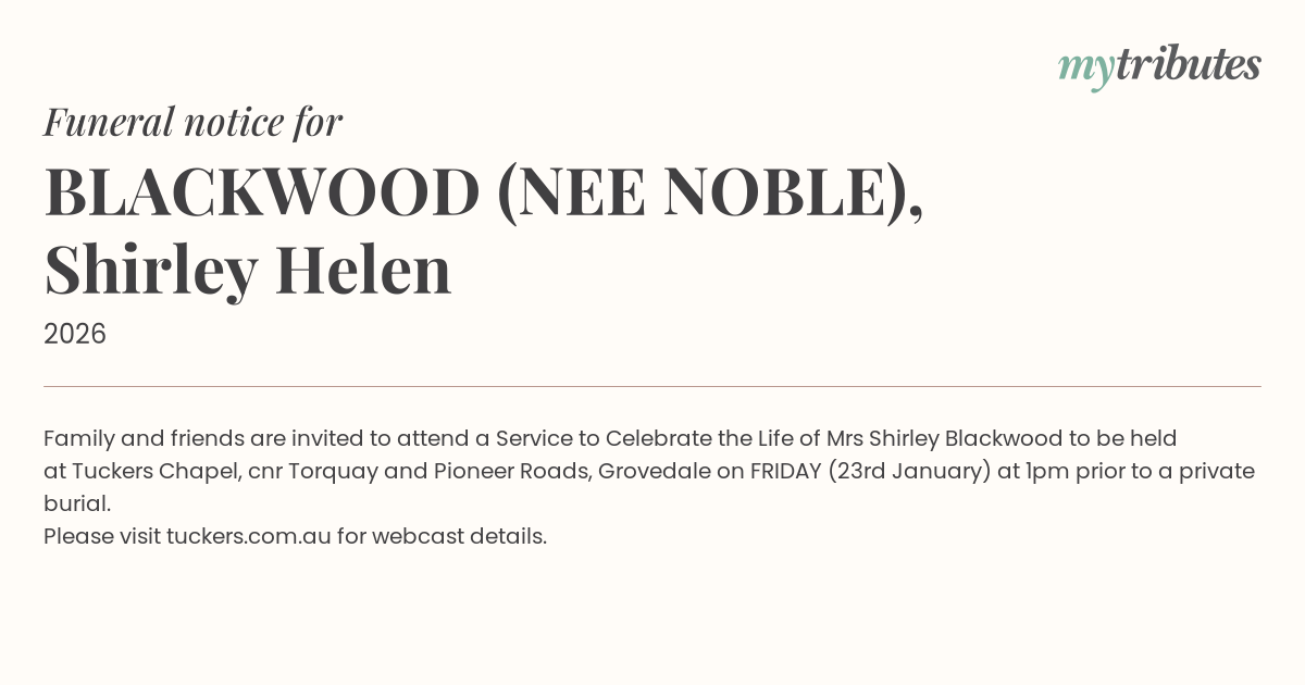 19°CFamily and friends are invited to attend a Service to Celebrate the Life of Mrs Shirley Blackwood to be held at Tuckers Chapel, cnr Torquay and Pioneer Roads, Grovedale on FRIDAY (23rd January) at 1pm prior to a private burial.