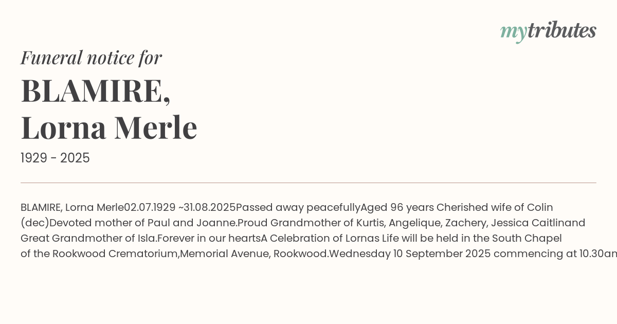 A Celebration of Lorna’s Life will be held in the South Chapel of the Rookwood Crematorium,