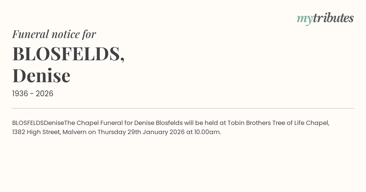 The Chapel Funeral for Denise Blosfelds will be held at Tobin Brothers Tree of Life Chapel,