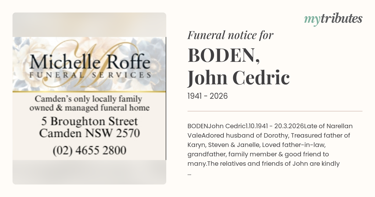 The relatives and friends of John are kindly invited to attend his Funeral Service to be held on Monday 30th March 2026 in the Granary at Belgenny Farm, Camden commencing at 11:00am.