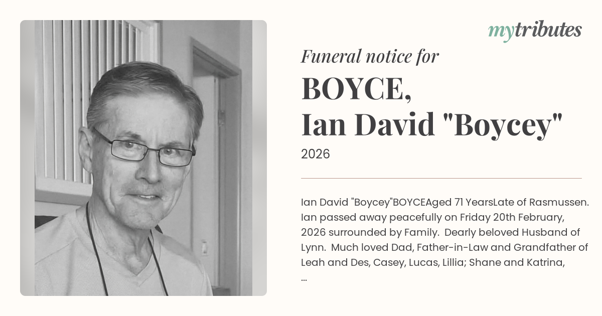 Late of Rasmussen. Ian passed away peacefully on Friday 20th February, 2026 surrounded by Family. Dearly beloved Husband of Lynn. Much loved Dad, Father-in-Law and Grandfather of Leah and Des, Casey, Lucas, Lillia; Shane and Katrina, Isabella and Sophie. Loved Brother, Brother-in-Law, Uncle and Great Soccer Mentor to many.