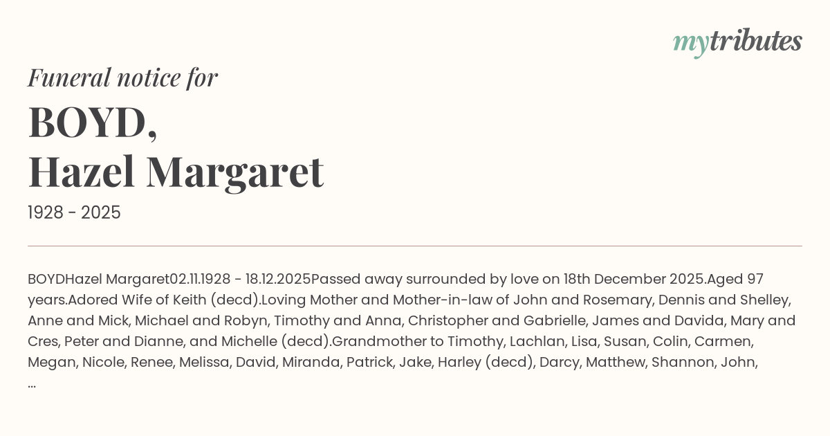 Family and Friends are invited to attend a Celebration of Hazel’s life to be held in the Pinnaroo Lawn Cemetery Chapel, 285 Graham Rd, Bridgeman Downs, on Tuesday 30th December 2025 at 11.00am.