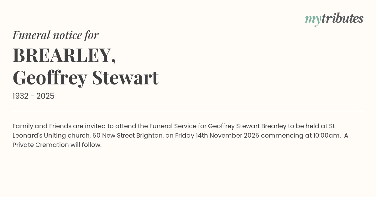 19°CFamily and Friends are invited to attend the Funeral Service for Geoffrey Stewart Brearley to be held at St Leonard's Uniting church, 50 New Street Brighton, on Friday 14th November 2025 commencing at 10:00am. A Private Cremation will follow.
