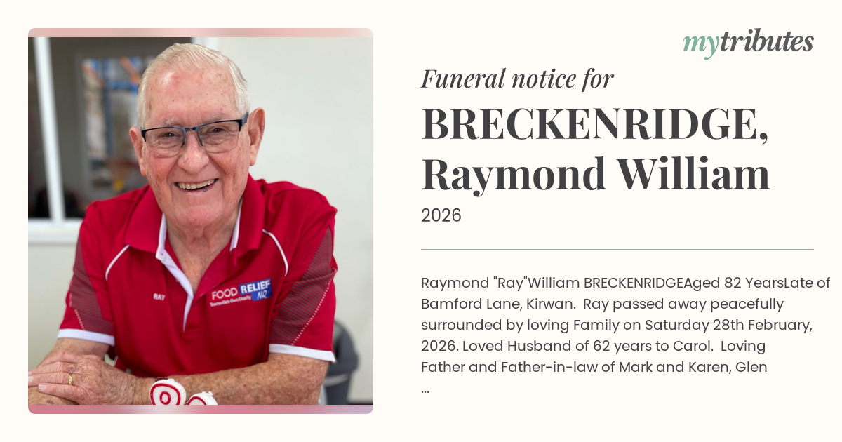 Late of Bamford Lane, Kirwan. Ray passed away peacefully surrounded by loving Family on Saturday 28th February, 2026. Loved Husband of 62 years to Carol. Loving Father and Father-in-law of Mark and Karen, Glen (deceased) and Kylie. Cherished Grandfather of Lachlan and Madison. Beloved Brother of Diane Sampson.