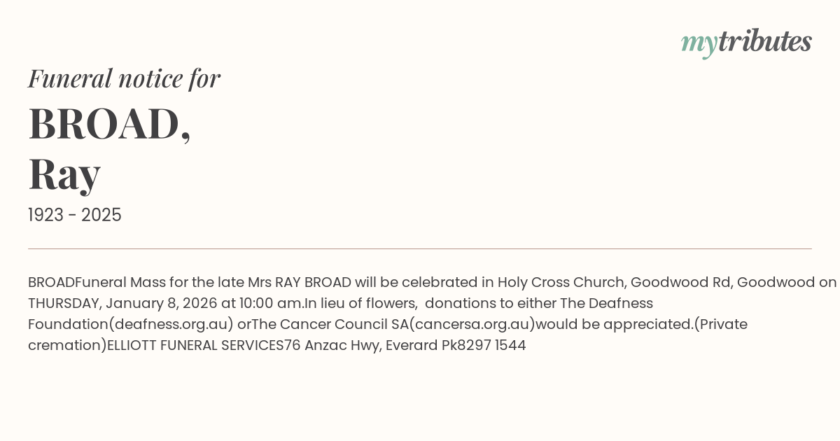 Funeral Mass for the late Mrs RAY BROAD