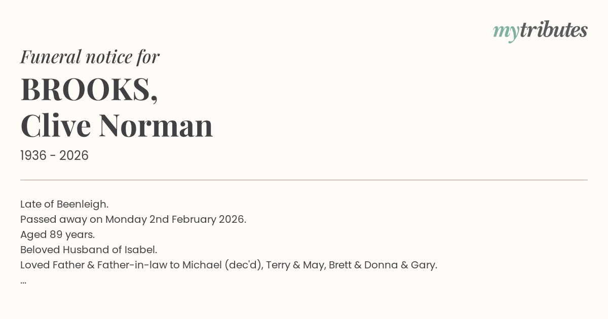 Relatives & Friends are respectfully invited to attend His Funeral Service to be held at St Peter's Lutheran Church, 187 Alberton Rd, Alberton on Friday 13th February 2026 at 10.30am.