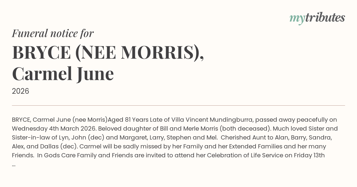 Late of Villa Vincent Mundingburra, passed away peacefully on Wednesday 4th March 2026. Beloved daughter of Bill and Merle Morris (both deceased). Much loved Sister and Sister-in-law of Lyn, John (dec) and Margaret, Larry, Stephen and Mel. Cherished Aunt to Alan, Barry, Sandra, Alex, and Dallas (dec).