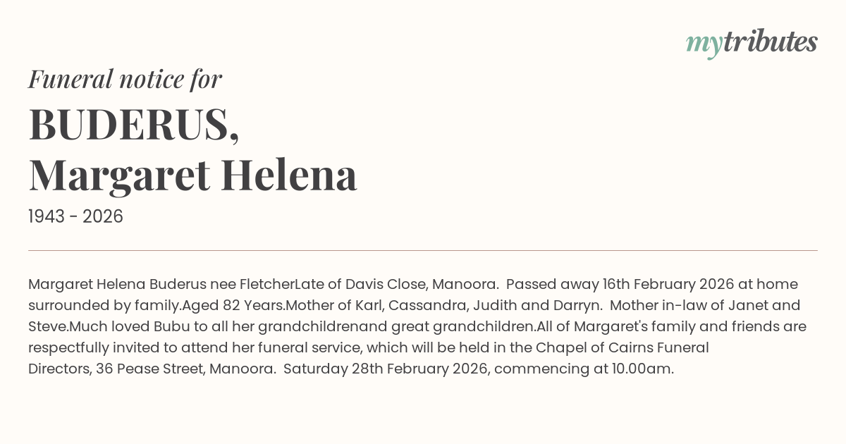 All of Margaret's family and friends are respectfully invited to attend her funeral service, which will be held in the Chapel of Cairns Funeral Directors, 36 Pease Street, Manoora. Saturday 28th February 2026, commencing at 10.00am.