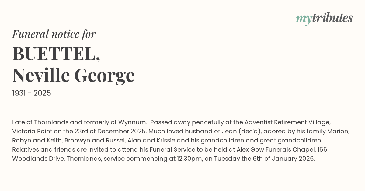19°CLate of Thornlands and formerly of Wynnum. Passed away peacefully at the Adventist Retirement Village, Victoria Point on the 23rd of December 2025. Much loved husband of Jean (dec'd), adored by his family Marion, Robyn and Keith, Bronwyn and Russel, Alan and Krissie and his grandchildren and great grandchildren. Relatives and friends are invited to attend his Funeral Service to be held at Alex Gow Funerals Chapel, 156 Woodlands Drive, Thornlands, service commencing at 12.30pm, on Tuesday the 6th of January 2026.