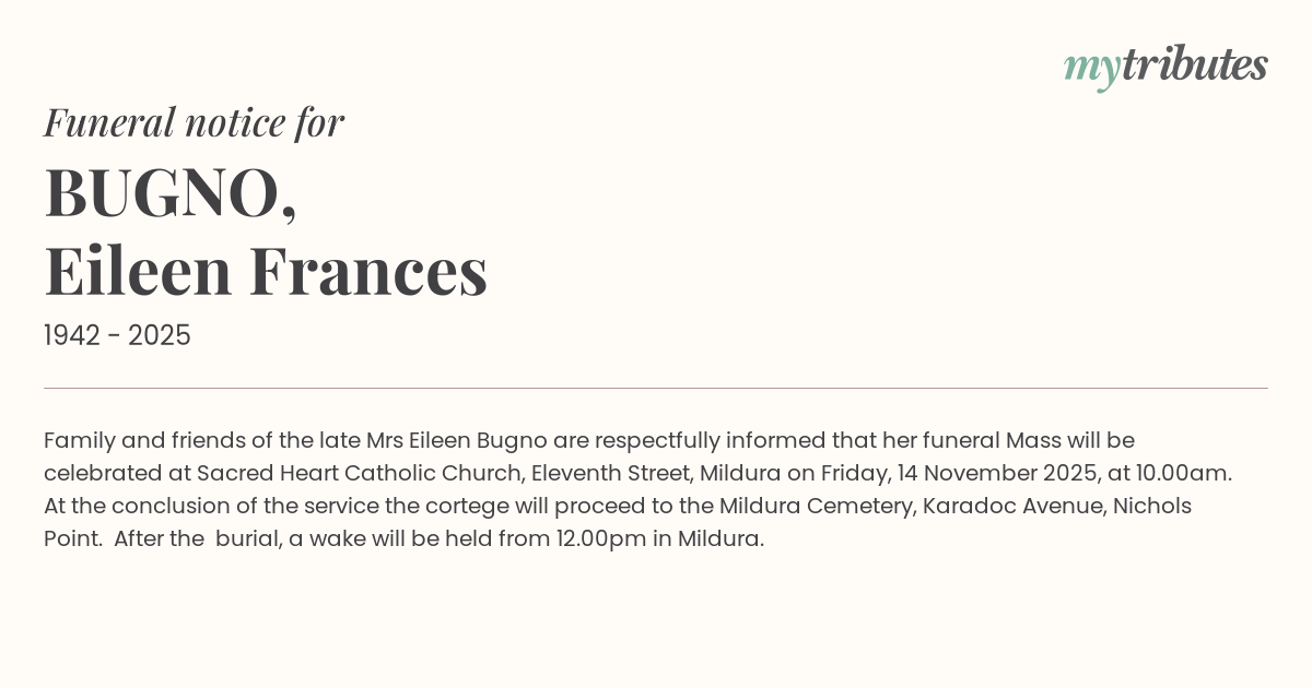 19°CFamily and friends of the late Mrs Eileen Bugno are respectfully informed that her funeral Mass will be celebrated at Sacred Heart Catholic Church, Eleventh Street, Mildura on Friday, 14 November 2025, at 10.00am.