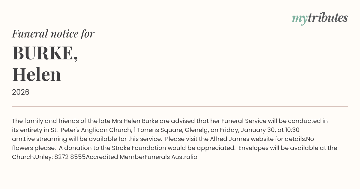 19°CThe family and friends of the late Mrs Helen Burke are advised that her Funeral Service will be conducted in its entirety in St. Peter's Anglican Church, 1 Torrens Square, Glenelg, on Friday, January 30, at 10:30 am.