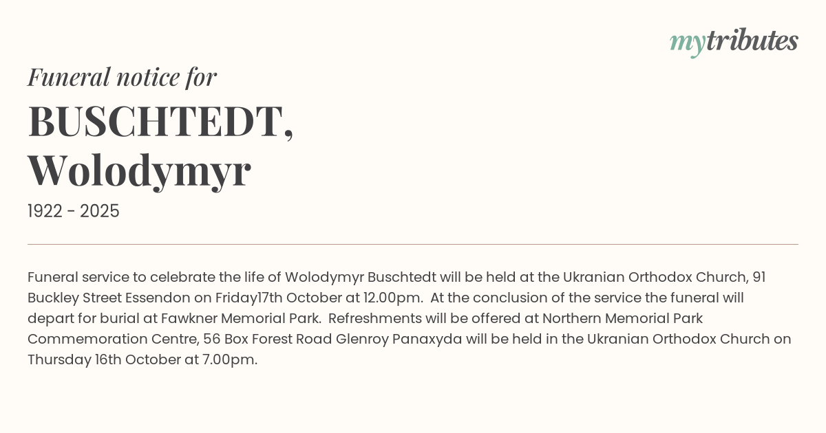 19°CFuneral service to celebrate the life of Wolodymyr Buschtedt will be held at the Ukranian Orthodox Church, 91 Buckley Street Essendon on Friday17th October at 12.00pm. At the conclusion of the service the funeral will depart for burial at Fawkner Memorial Park. Refreshments will be offered at Northern Memorial Park Commemoration Centre, 56 Box Forest Road Glenroy Panaxyda will be held in the Ukranian Orthodox Church on Thursday 16th October at 7.00pm.