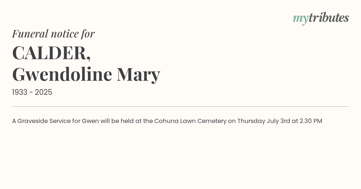 19°CA Graveside Service for Gwen will be held at the Cohuna Lawn Cemetery on Thursday July 3rd at 2.30 PM