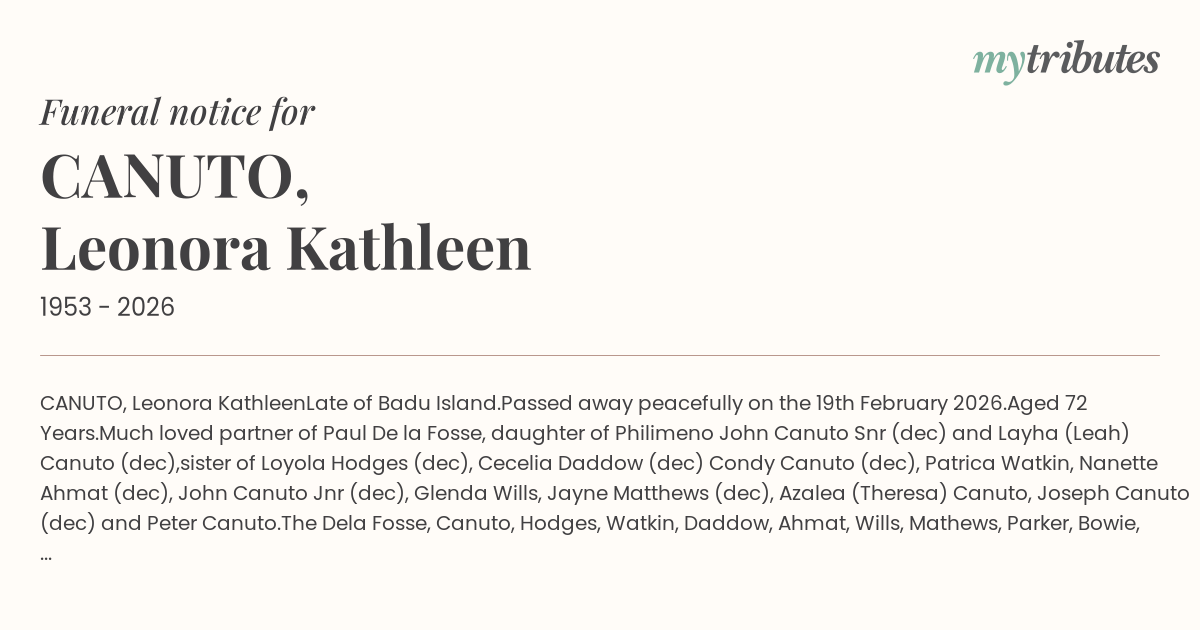 sister of Loyola Hodges (dec), Cecelia Daddow (dec) Condy Canuto (dec), Patrica Watkin, Nanette Ahmat (dec), John Canuto Jnr (dec), Glenda Wills, Jayne Matthews (dec), Azalea (Theresa) Canuto, Joseph Canuto (dec) and Peter Canuto.
