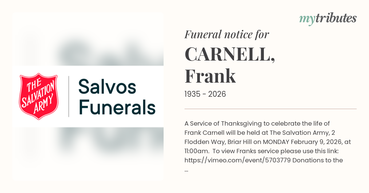 19°CA Service of Thanksgiving to celebrate the life of Frank Carnell will be held at The Salvation Army, 2 Flodden Way, Briar Hill on MONDAY February 9, 2026, at 11:00am.