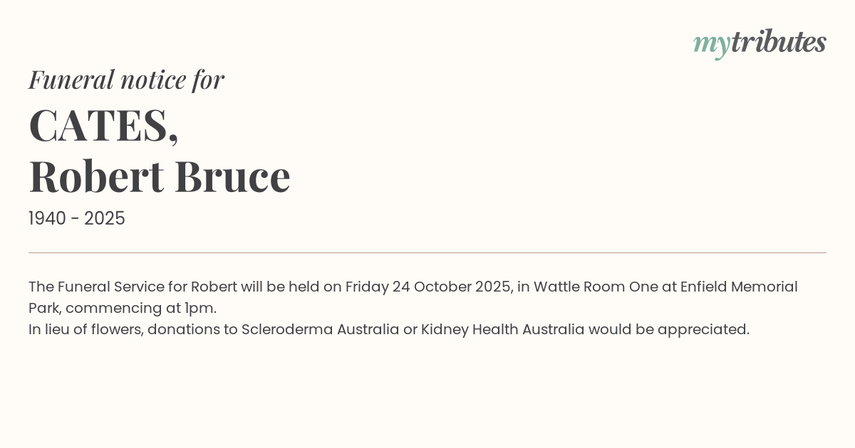 19°CThe Funeral Service for Robert will be held on Friday 24 October 2025, in Wattle Room One at Enfield Memorial Park, commencing at 1pm.