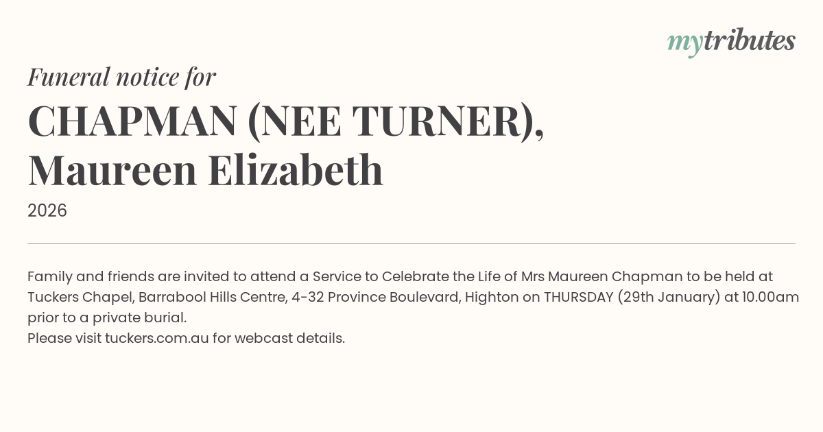 19°CFamily and friends are invited to attend a Service to Celebrate the Life of Mrs Maureen Chapman to be held at Tuckers Chapel, Barrabool Hills Centre, 4-32 Province Boulevard, Highton on THURSDAY (29th January) at 10.00am prior to a private burial.