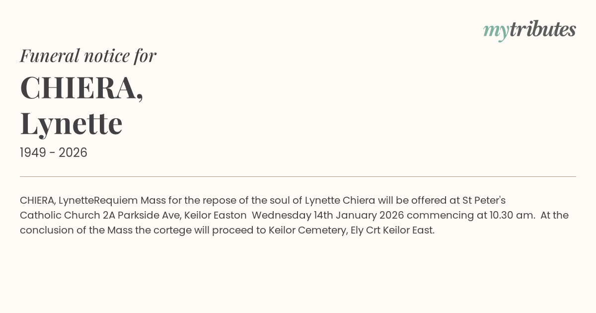 Requiem Mass for the repose of the soul of Lynette Chiera will be offered at