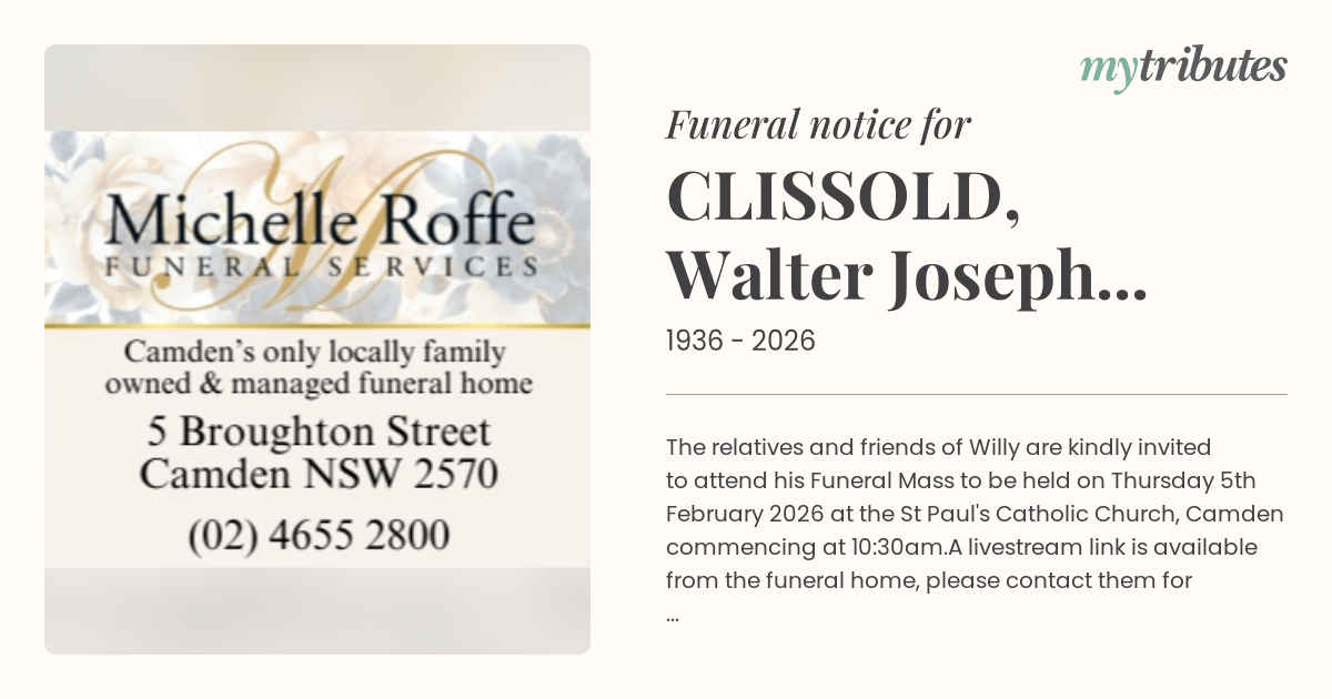 19°CThe relatives and friends of Willy are kindly invited to attend his Funeral Mass to be held on Thursday 5th February 2026 at the St Paul's Catholic Church, Camden commencing at 10:30am.