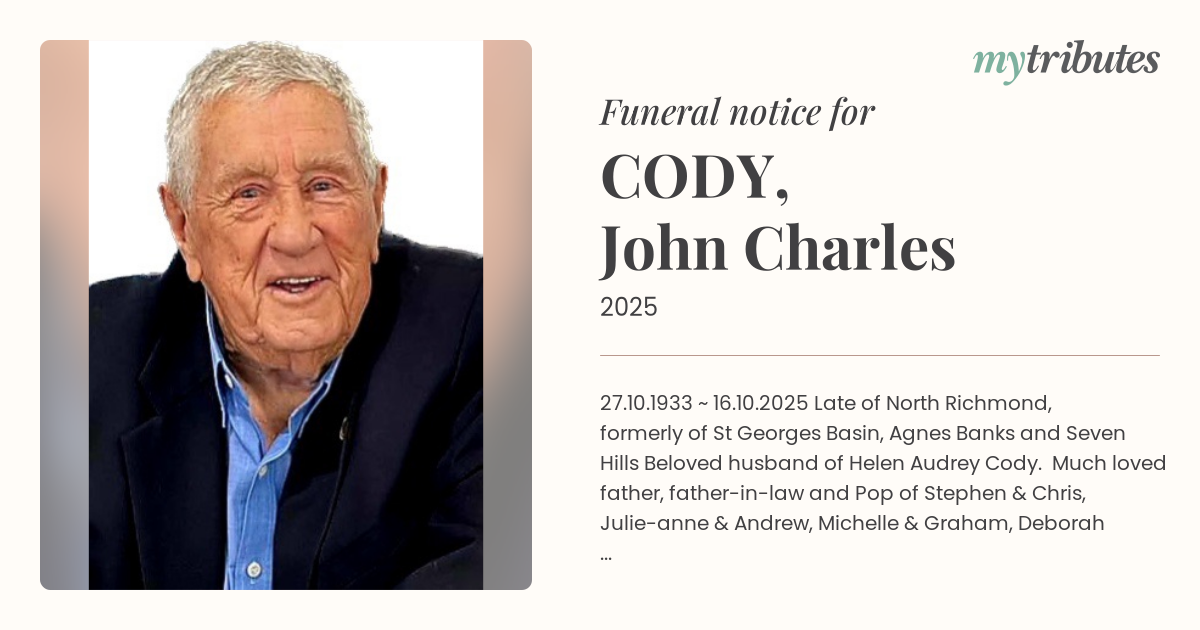 19°C27.10.1933 ~ 16.10.2025 Late of North Richmond, formerly of St Georges Basin, Agnes Banks and Seven Hills Beloved husband of Helen Audrey Cody. Much loved father, father-in-law and Pop of Stephen & Chris, Julie-anne & Andrew, Michelle & Graham, Deborah & Bradley, Dean & Lindy, and their families. His cheeky humour and storytelling will be strongly missed. We invite family and friends to join us in the celebration of his life on Tuesday, 28th October 2025 at Our Lady of the Rosary Catholic Church, 26 Swanston Street, St Marys, appointed to commence at 11.00 am followed by burial at the Upper Castlereagh Methodist Cemetery, 297-305 Old Castlereagh Road, Castlereagh.