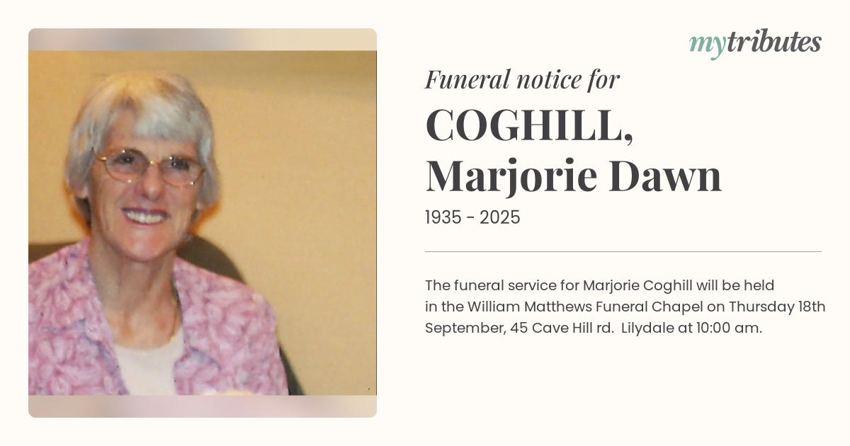 19°CThe funeral service for Marjorie Coghill will be held in the William Matthews Funeral Chapel on Thursday 18th September, 45 Cave Hill rd. Lilydale at 10:00 am.