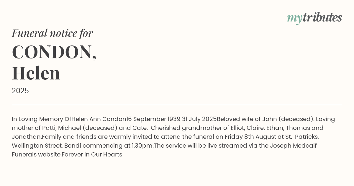 Family and friends are warmly invited to attend the funeral on Friday 8th August at St. Patricks, Wellington Street, Bondi commencing at 1.30pm.