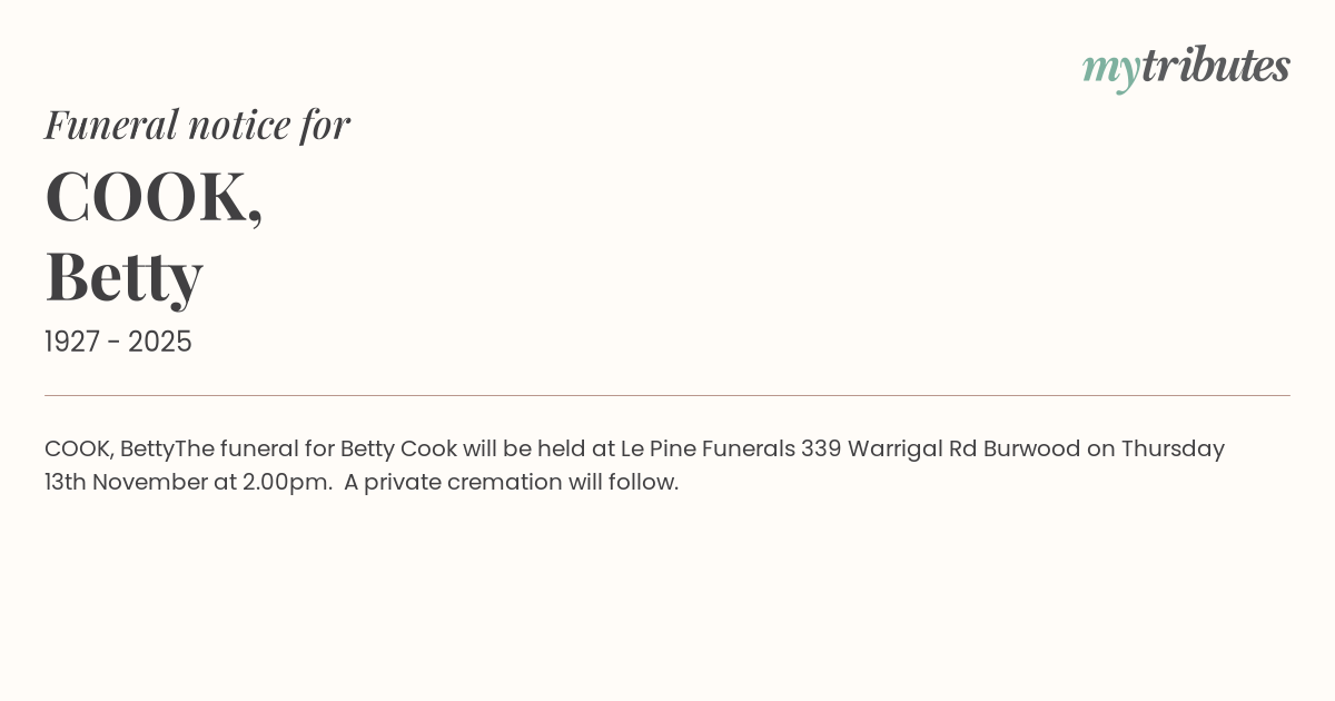 The funeral for Betty Cook will be held at Le Pine Funerals 339 Warrigal Rd Burwood on Thursday 13th November at 2.00pm.