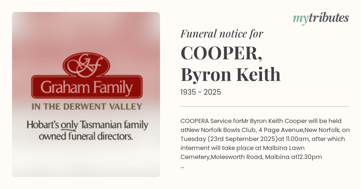 at 11.00am, after which interment will take place at Malbina Lawn Cemetery,