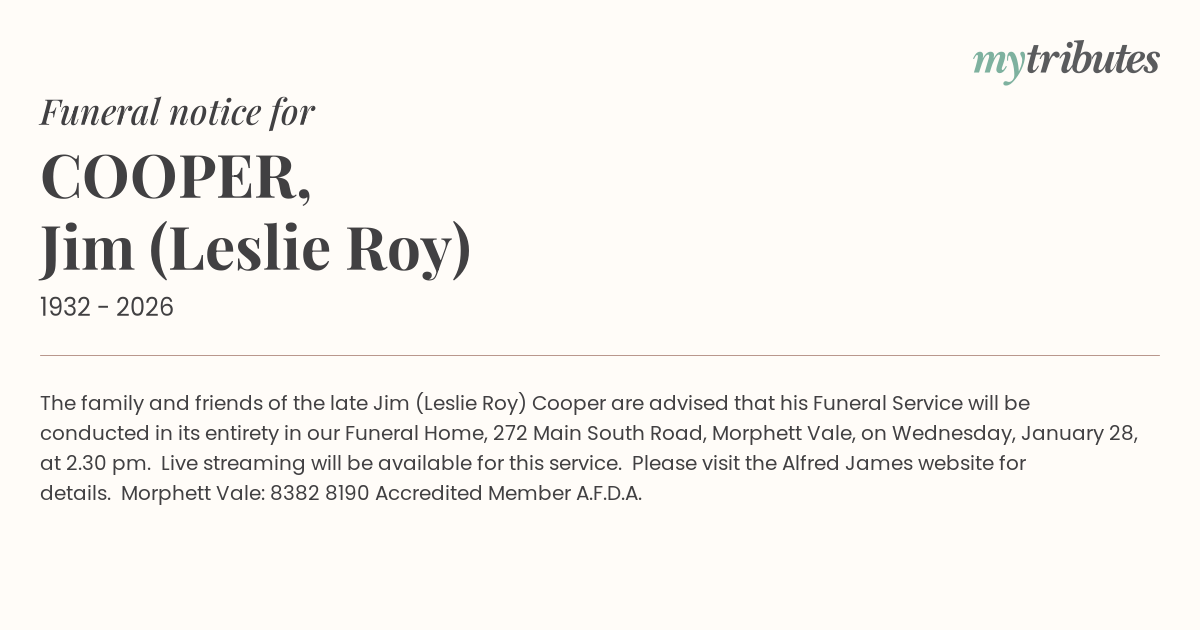 19°CThe family and friends of the late Jim (Leslie Roy) Cooper are advised that his Funeral Service will be conducted in its entirety in our Funeral Home, 272 Main South Road, Morphett Vale, on Wednesday, January 28, at 2.30 pm.