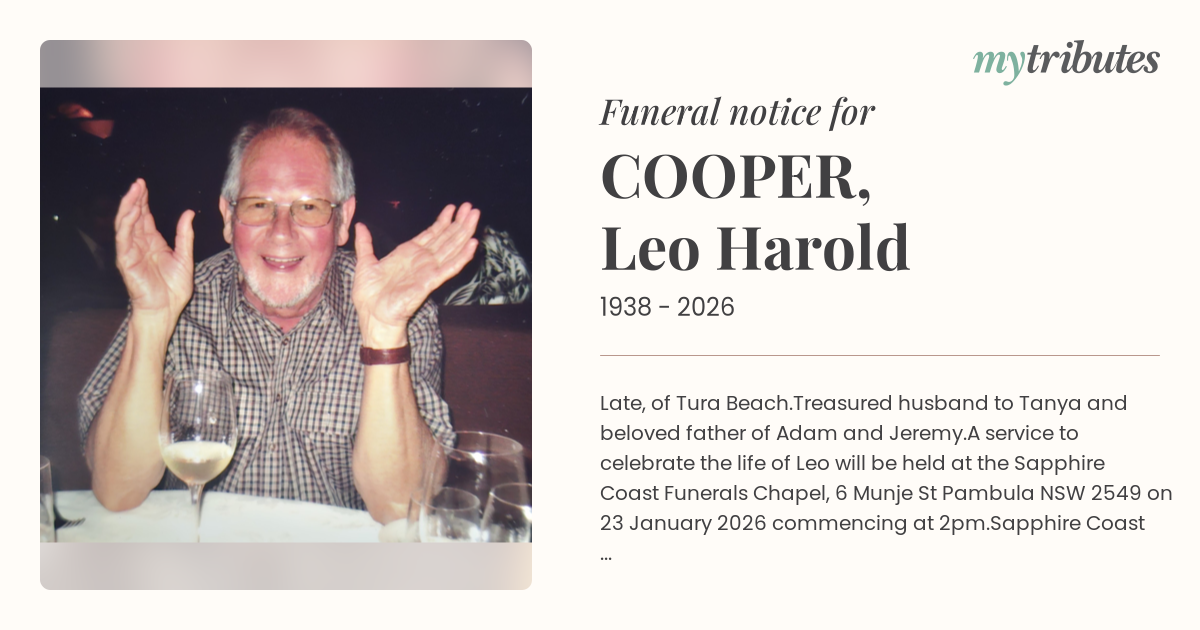 A service to celebrate the life of Leo will be held at the Sapphire Coast Funerals Chapel, 6 Munje St Pambula NSW 2549 on 23 January 2026 commencing at 2pm.