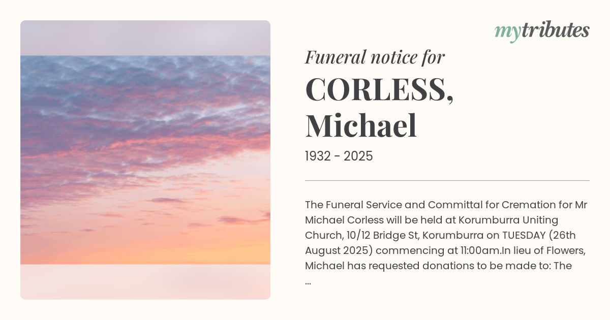 19°CThe Funeral Service and Committal for Cremation for Mr Michael Corless will be held at Korumburra Uniting Church, 10/12 Bridge St, Korumburra on TUESDAY (26th August 2025) commencing at 11:00am.