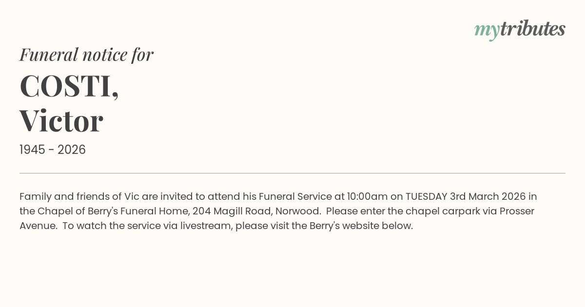19°CFamily and friends of Vic are invited to attend his Funeral Service at 10:00am on TUESDAY 3rd March 2026 in the Chapel of Berry's Funeral Home, 204 Magill Road, Norwood.