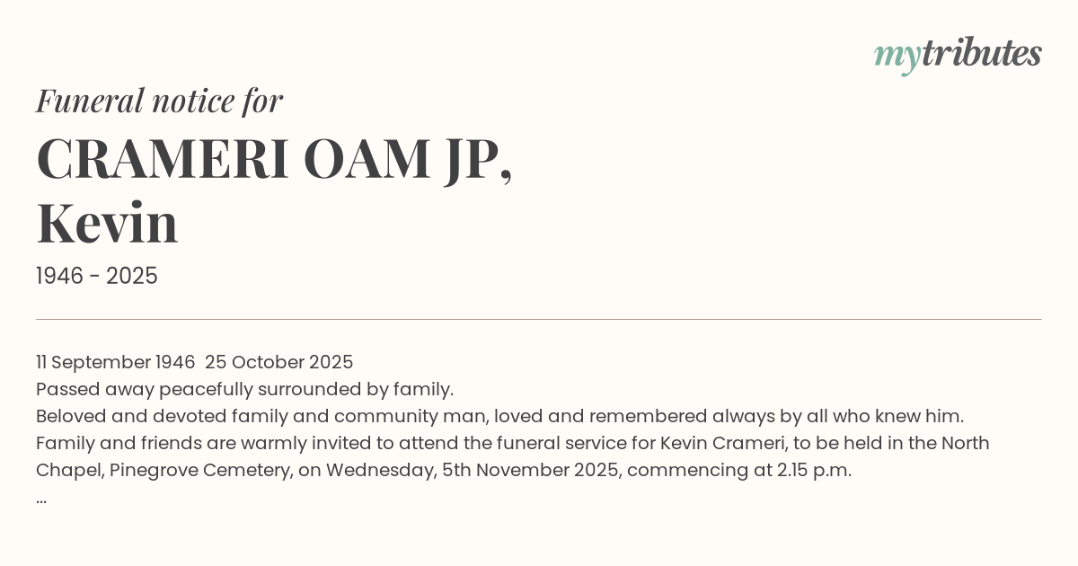 Family and friends are warmly invited to attend the funeral service for Kevin Crameri, to be held in the North Chapel, Pinegrove Cemetery, on Wednesday, 5th November 2025, commencing at 2.15 p.m.