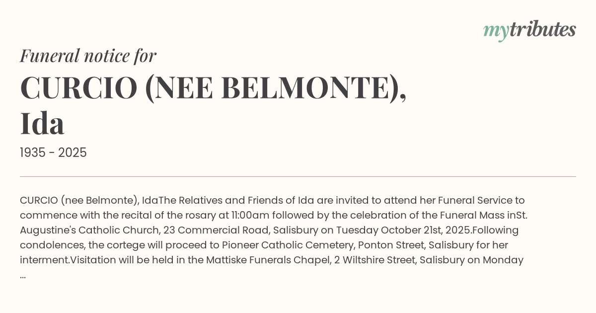The Relatives and Friends of Ida are invited to attend her Funeral Service to commence with the recital of the rosary at 11:00am followed by the celebration of the Funeral Mass in