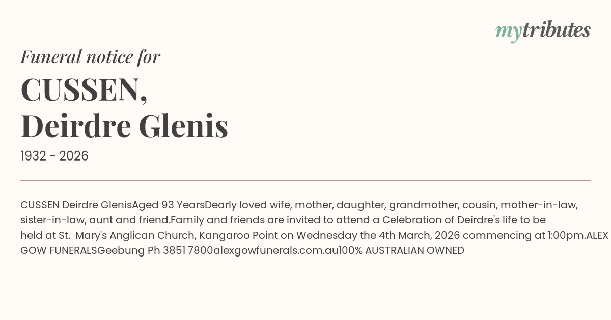 Family and friends are invited to attend a Celebration of Deirdre's life to be held at St. Mary's Anglican Church, Kangaroo Point on Wednesday the 4th March, 2026 commencing at 1:00pm.