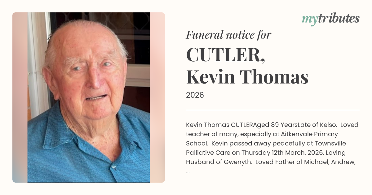 Late of Kelso. Loved teacher of many, especially at Aitkenvale Primary School. Kevin passed away peacefully at Townsville Palliative Care on Thursday 12th March, 2026. Loving Husband of Gwenyth. Loved Father of Michael, Andrew, Anne-Marie, Helen, Bruce, Douglas, Denis and Richard. Loving Father-in-Law, Grandfather and Great Grandfather. Brother of Colleen (deceased), George (deceased), Patricia (deceased), Terry, and Gary (deceased). Cherished Uncle, Cousin and Friend to many.