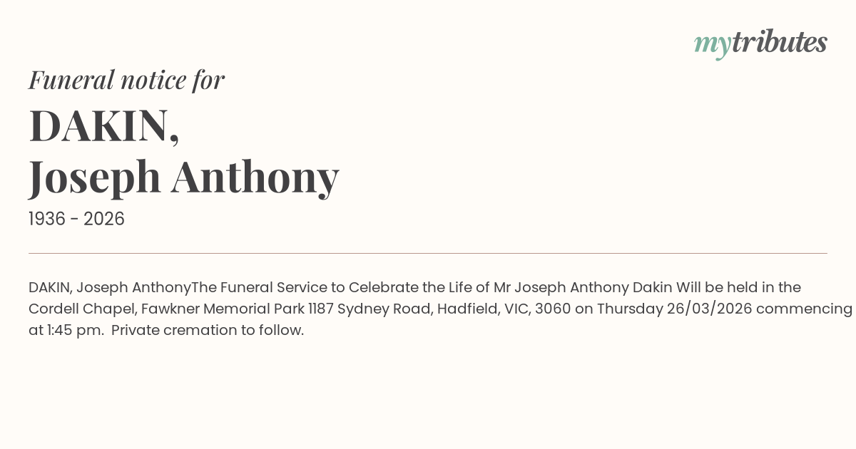 Mr Joseph Anthony Dakin Will be held in the Cordell Chapel, Fawkner Memorial Park 1187 Sydney Road, Hadfield, VIC, 3060 on Thursday 26/03/2026 commencing at 1:45 pm.