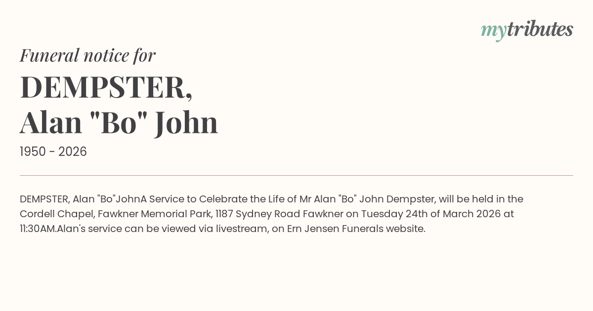 A Service to Celebrate the Life of Mr Alan "Bo" John Dempster, will be held in the