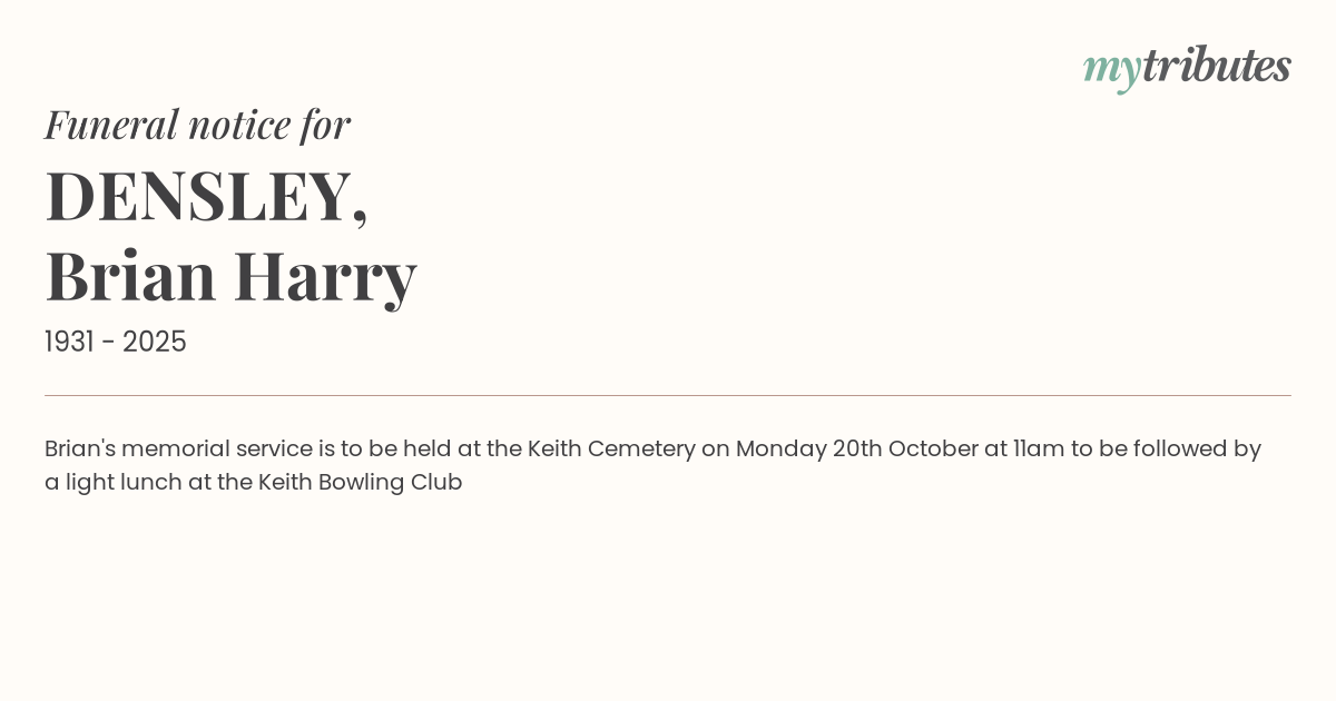 19°CBrian's memorial service is to be held at the Keith Cemetery on Monday 20th October at 11am to be followed by a light lunch at the Keith Bowling Club