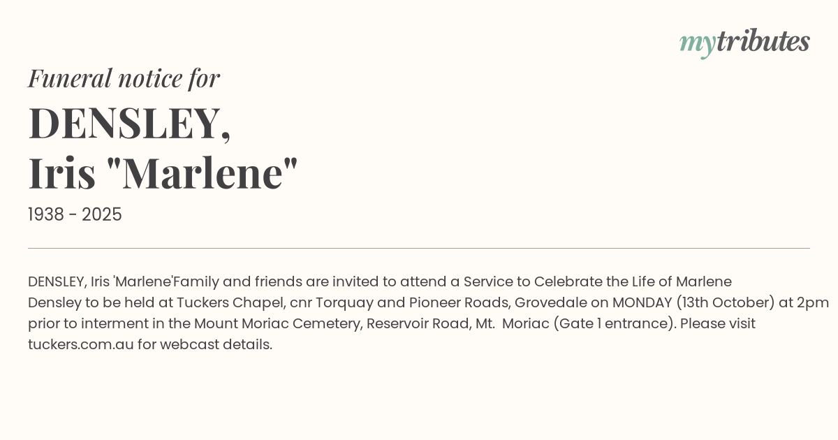 Family and friends are invited to attend a Service to Celebrate the Life of Marlene Densley to be held at Tuckers Chapel, cnr Torquay and Pioneer Roads, Grovedale on MONDAY (13th October) at 2pm prior to interment in the Mount Moriac Cemetery, Reservoir Road, Mt. Moriac (Gate 1 entrance).