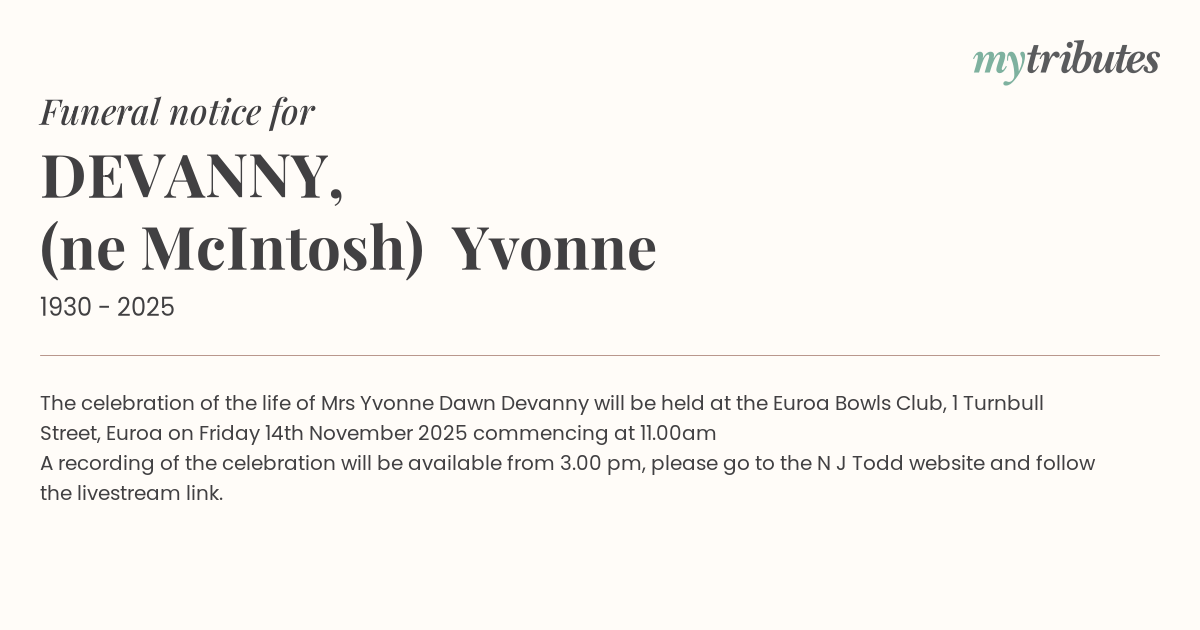 19°CThe celebration of the life of Mrs Yvonne Dawn Devanny will be held at the Euroa Bowls Club, 1 Turnbull Street, Euroa on Friday 14th November 2025 commencing at 11.00am
