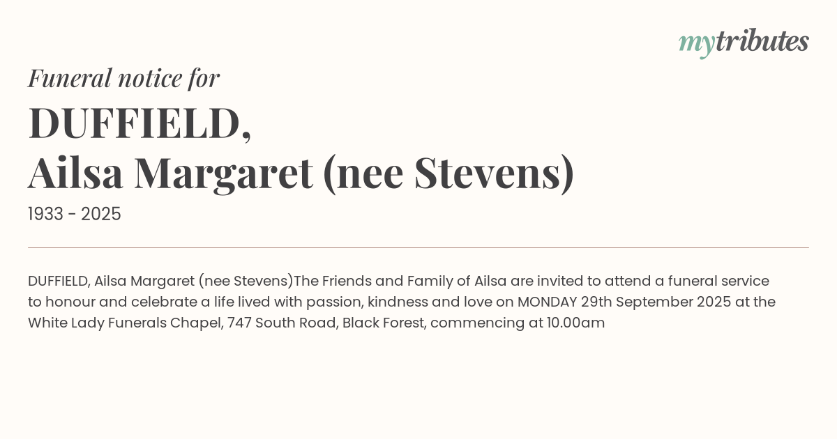 The Friends and Family of Ailsa are invited to attend a funeral service to honour and celebrate a life lived with passion, kindness and love on MONDAY 29th September 2025 at the White Lady Funerals Chapel, 747 South Road, Black Forest, commencing at 10.00am